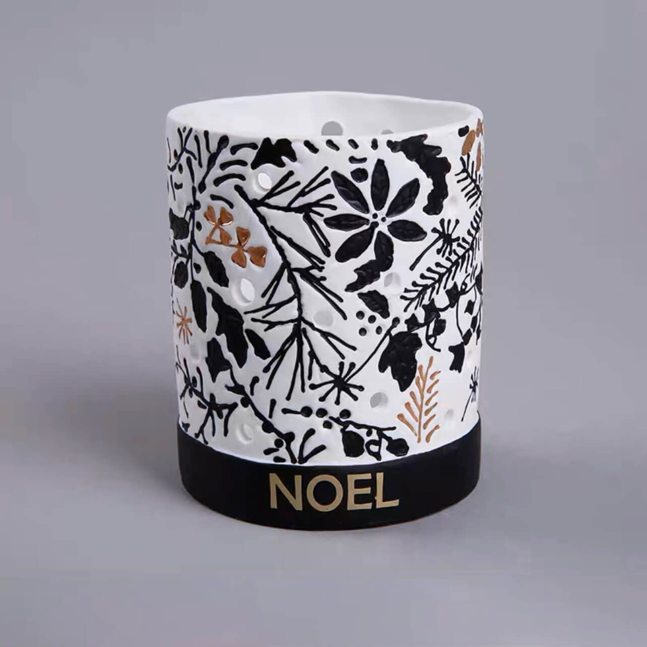 The candle holder cup features a pure white base that showcases the vibrant personality of the hand-painted illustrations. The artist uses red and green hues to depict classic Christmas imagery such as holly leaves, red berries, and stars, creating a lively and festive composition. The delicate lines and vibrant colors complement each other, showcasing a unique artistic beauty. The front of the cup is adorned with the golden word "NOEL," this French word for Christmas adds to the festive atmosphere, adding a final touch to the overall design.